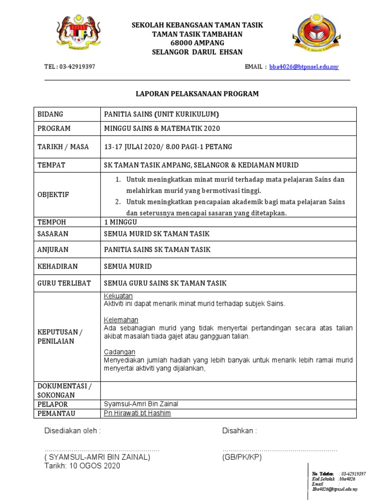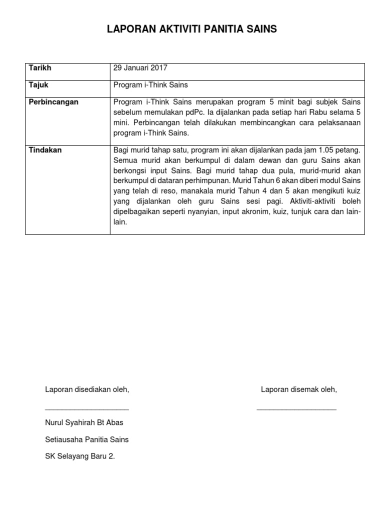 Sektor tajuk aktiviti tarikh tempat sasaran bil. Laporan aktiviti panitia sains. Setiap rabu kebiasaannya murid akan mengikut pelbagai aktiviti kokurikulum sama ada aktiviti unit beruniform sukan permainan ataupun kelab persatuan yang dianjurkan oleh pihak sekolah.